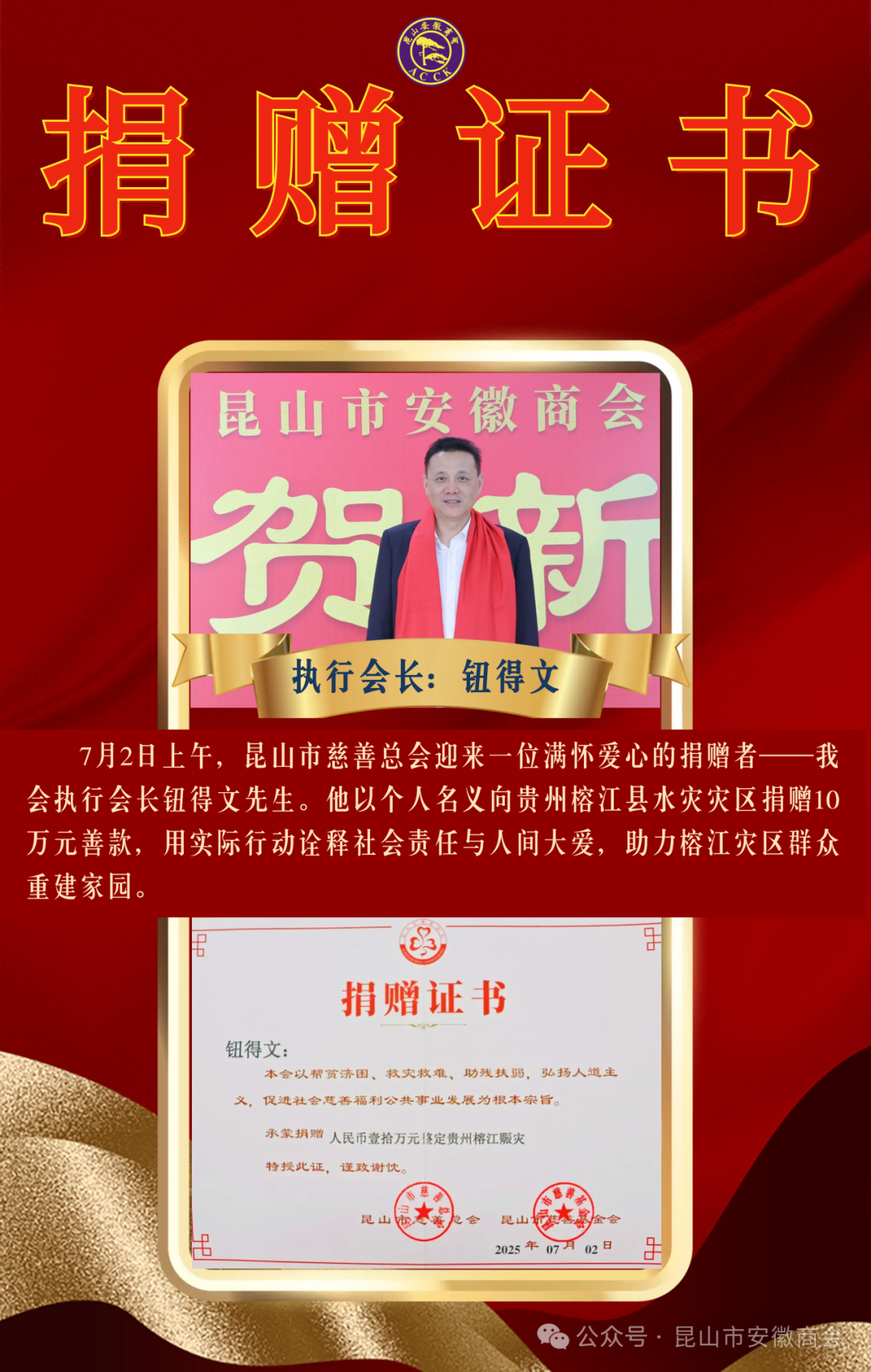 作为昆山市安徽商会执行会长,钮得文先生在商界打拼多年,事业有成。但他始终牢记企业家的社会责任,积极投身公益慈善事业,多次向困难地区和群体伸出援手。此次对榕江灾区的捐赠,不仅是对受灾群众的物质支持,更是传递了一份跨越千里的温暖与希望,彰显了企业家心怀天下、无私奉献的高尚情怀。