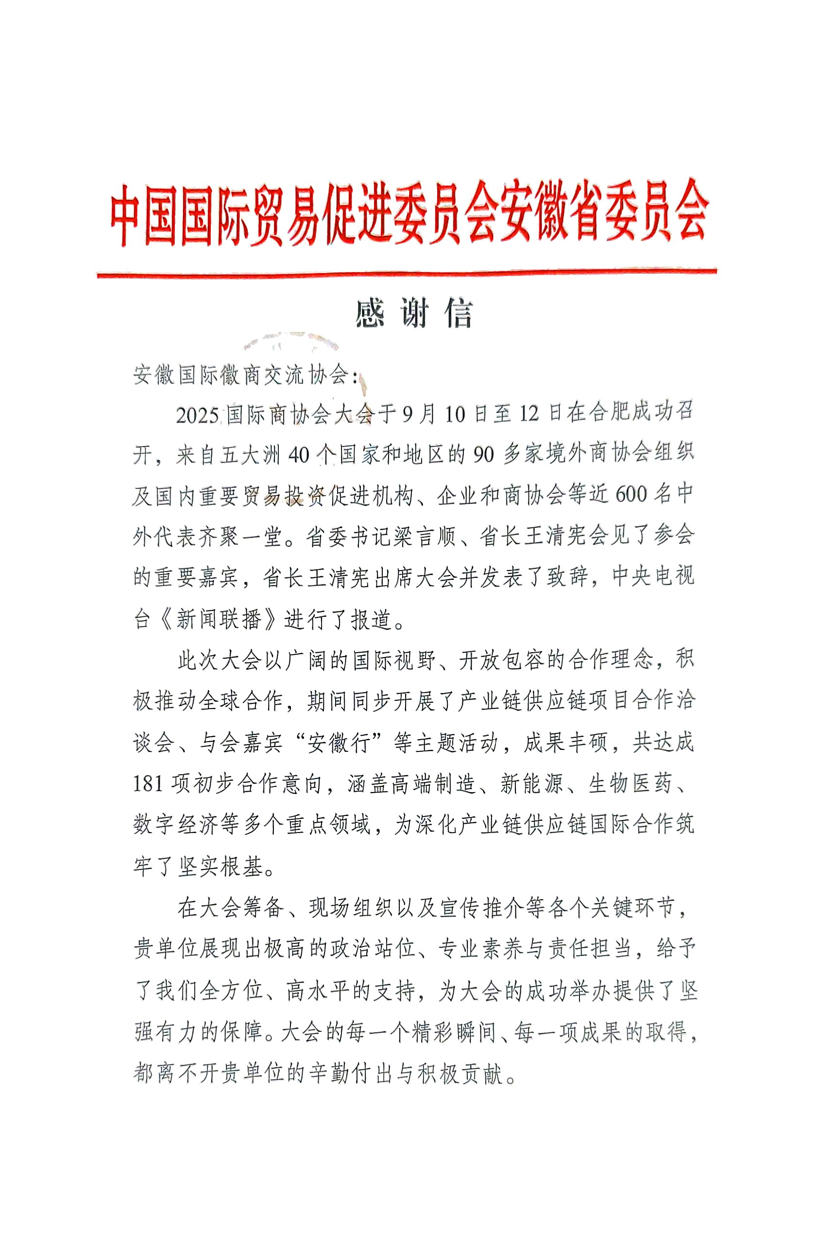 近日,我会收到中国国际贸易促进委员会安徽省委员会的感谢信,期待与其在未来深化合作,充分发挥桥梁纽带作用,携手共进。